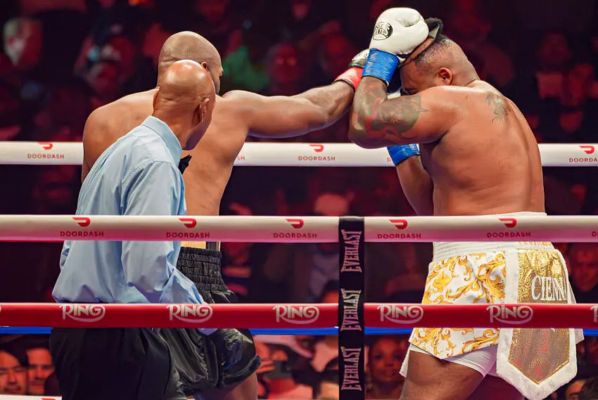Lors du deuxième round, alors que les échanges devenaient plus intenses, un coup puissant a projeté la tête de Miller vers l’arrière. Sous l’impact, sa perruque s’est décollée, dévoilant brièvement une large zone dégarnie avant de retomber. Entre les rounds, le poids lourd a finalement décidé de la retirer complètement et de la jeter dans le public, avant de revenir au centre du ring comme si rien ne s’était passé.
